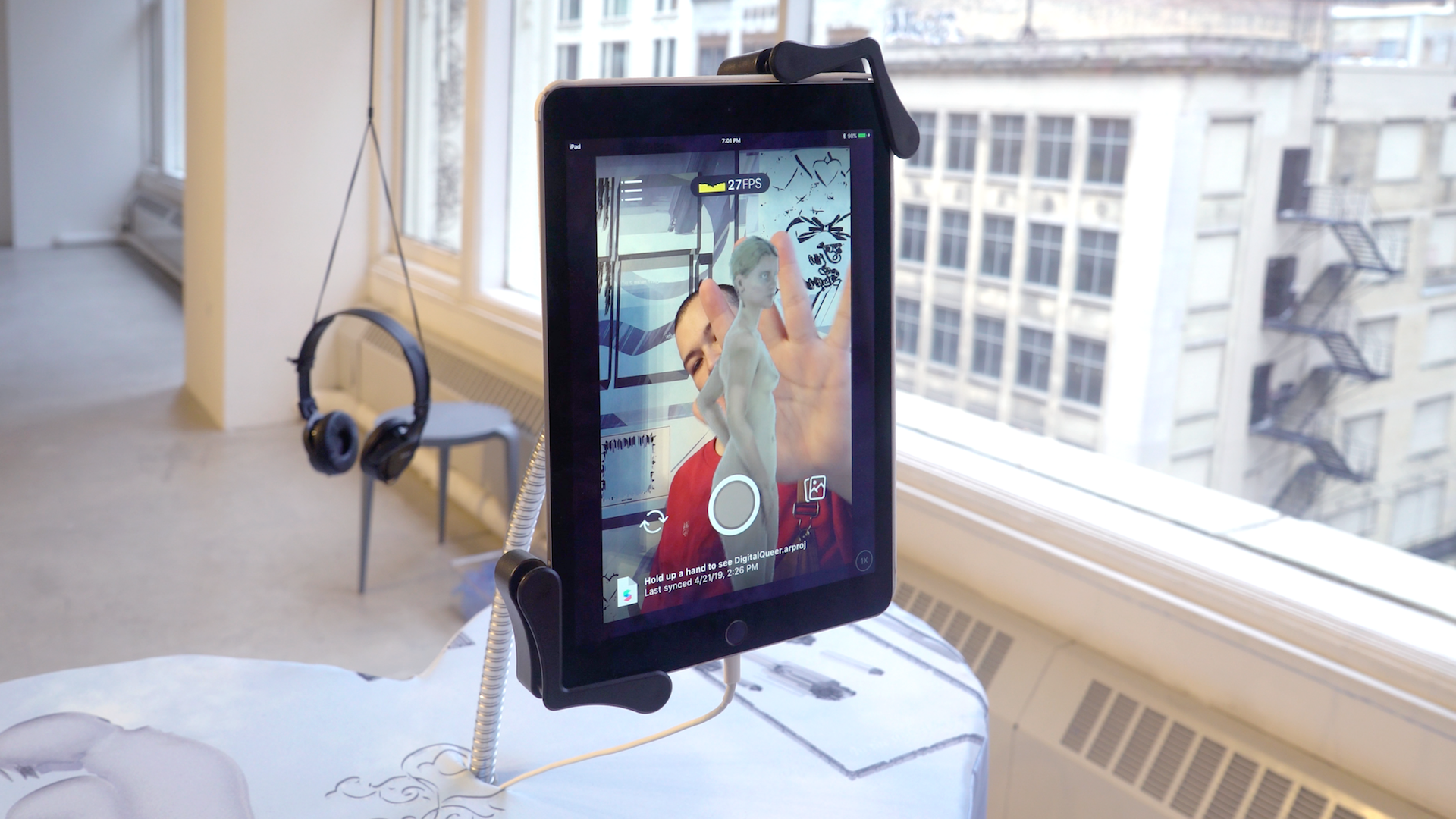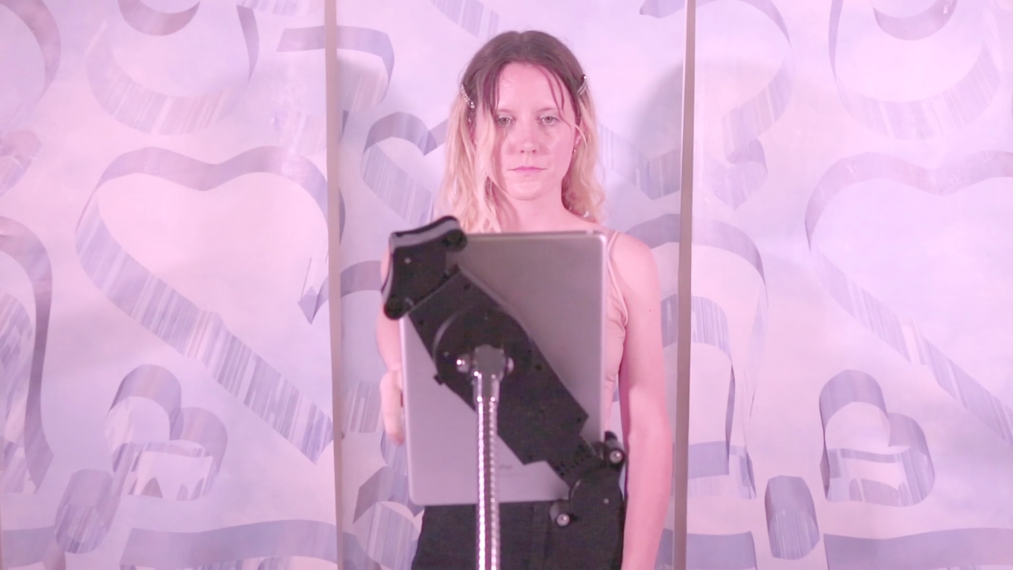 Pleasure After Consciousness, 2019, 4K video, augmented reality, binaural sound, wallpaper, Lycra iPad stands, 3D printed iPad cases, 4:22 min